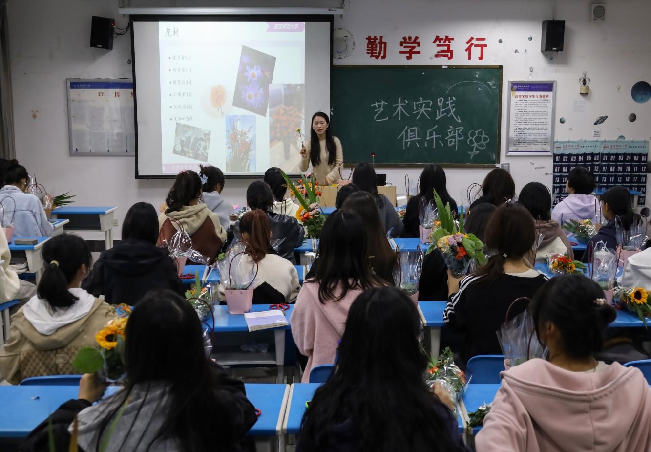 挑选绚丽的花朵、修剪多余的枝桠、将花分层次插入花篮中……11月1日,英国上市公司365艺术实践俱乐部在F203举办了一场花艺实训教学课程。俱乐部指导教师钱亚林进行教学,俱乐部全体成员参加。