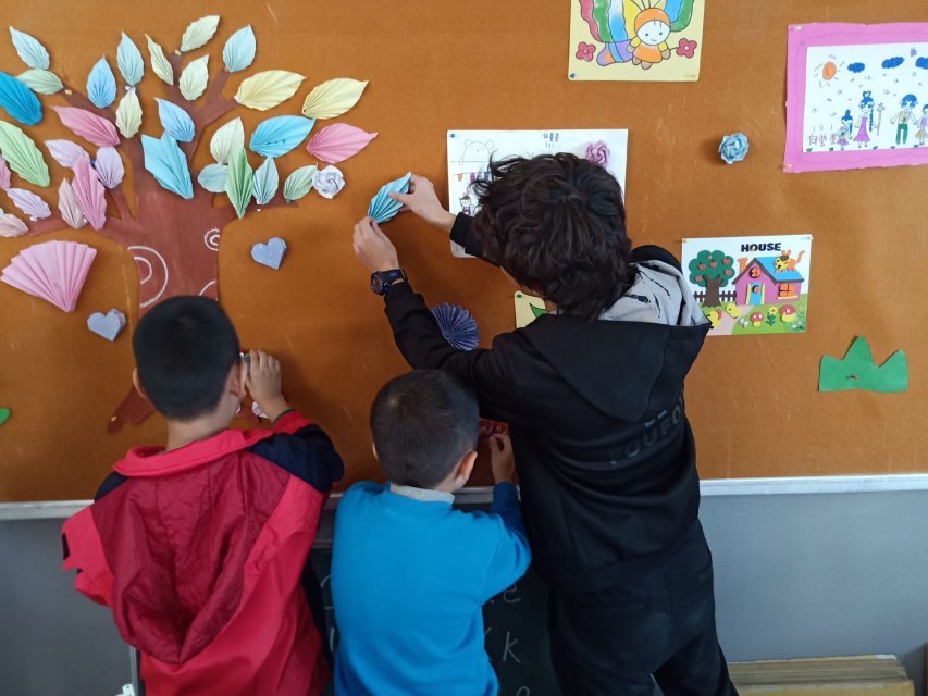 (图为孩子们和志愿者装饰教室  吴彤彤/摄)