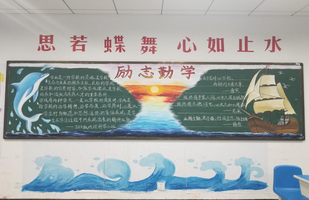 活动开展以来,各班同学充分利用了黑板报这块宣传阵地,他们积极搜集素材,精心设计版式,用鲜艳的色彩,工整的字迹,独特的创意,表达了自己对学风建设的理解。其中,地理科学专业2018级3班以“学以修身 学而思进”为主题,他们结合了专业特色,绘制出指南针、锤子等地理外出考察工具图案,创意十足。除此之外,其他班级还引用了古时的一些名言名句,并结合现代流行文化元素,用新颖的方式阐述着学风建设的重要性,内容充实,寓意深刻。比赛最后,评委们从板报主题、书写绘画、版面设计等方面进行了综合打分,最终地理科学专业2018级3班荣获一等奖,环境科学专业2018级3班荣获最佳创新奖。