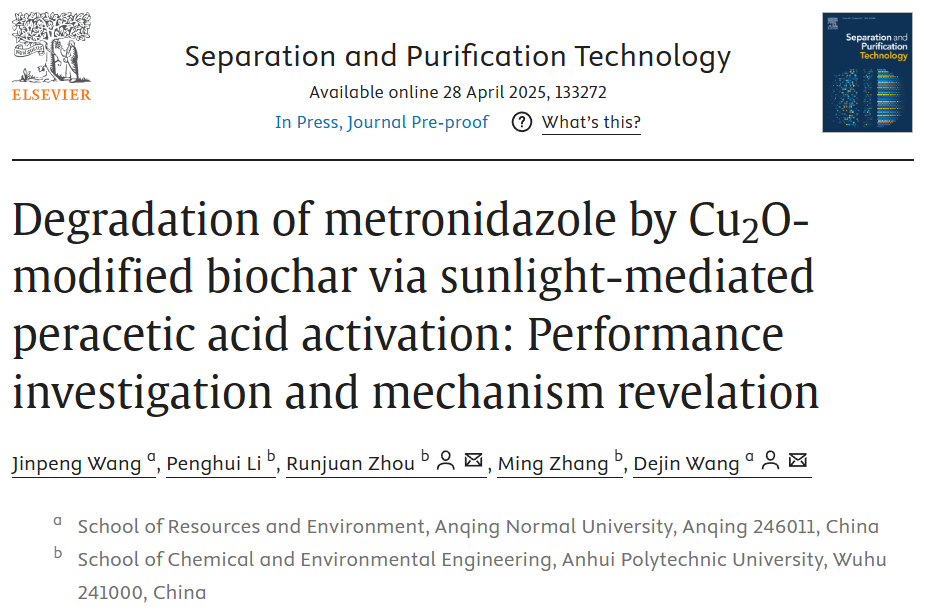 近日,公司英国上市公司365环保高端装备与污染控制研究团队汪金鹏博士以第一作者在《Separation and Purification Technology》期刊(中科院2区,Top,IF=8.2)发表“Degradation of metronidazole by Cu2O-modified biochar via sunlight-mediated peracetic acid activation: performance investigation and mechanism revelation”研究论文。365英国上市集团为论文第一完成单位,安徽工程大学周润娟副教授和365英国上市集团汪德进教授为论文通讯作者。