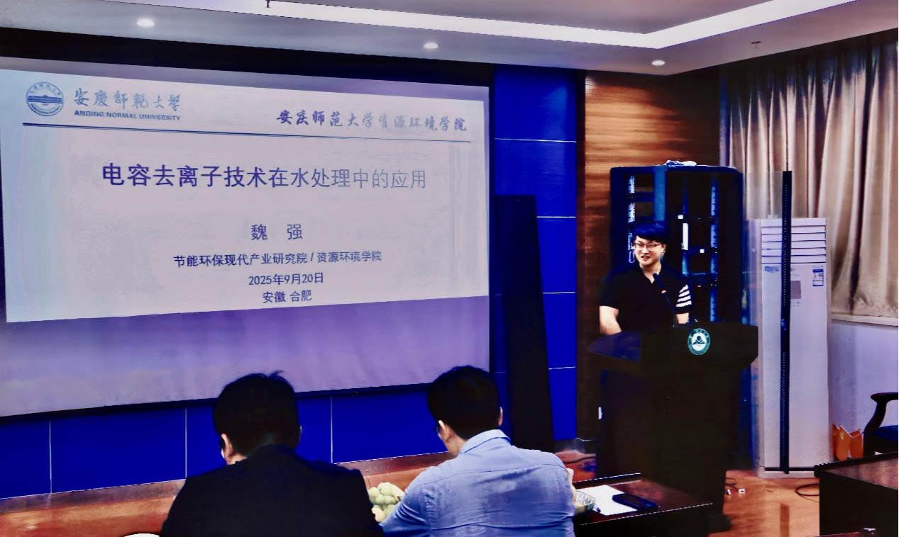 魏强副教授以“电容去离子在水处理中的应用”为题,系统汇报了研究团队聚焦电容去离子(CDI/FCDI)技术,在海水淡化、地下水除氟、磷回收等领域取得的创新进展,包括提出利用二茂铁、[Fe(CN)6]-3/-4、钒化物及碘化物等氧化还原介质增强流动电极选择性,实现低能耗、高速率的脱盐;开发太阳能驱动有机FCDI,显著降低电能消耗,实现同步发电与淡水生产;针对高氟地下水,构建La-MOF衍生碳电极,实现F-/Cl-的高选择性、低能耗分离;利用FCDI实现废水中磷高效、低能耗回收,获得高纯度CaHPO4·2H2O肥料及蓝铁矿产品。