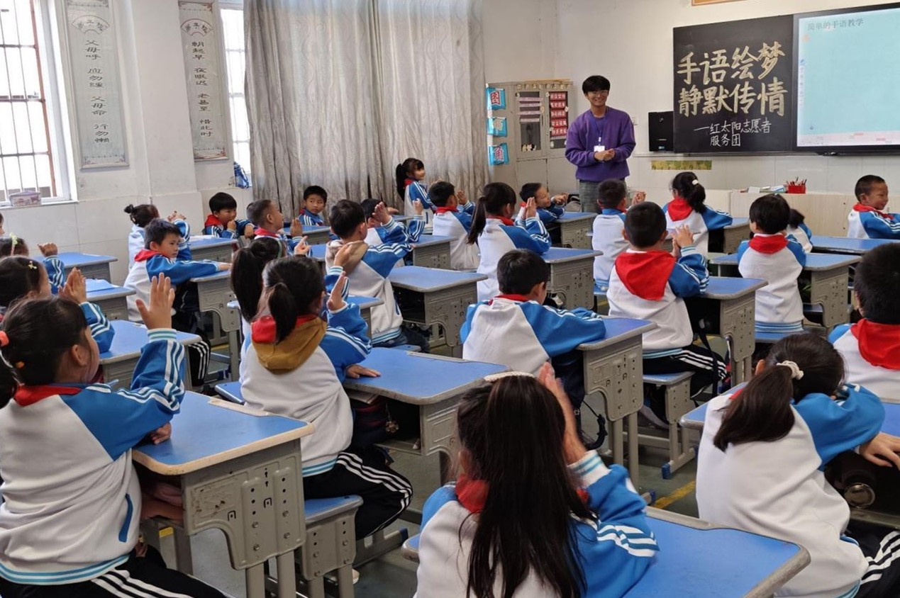 在手语绘梦活动的理论课上,环境科学与工程类2024级2班栾宁详细阐释手语的适用范围及意义,引导同学们以正确的态度看待聋哑人。通过这节课的学习,同学们掌握简单的手语,也深刻理解应正确看待聋哑人。正如钱锦涵小朋友所言:“我们要尊重他们,他们与我们并无不同,不能因他们听不见而轻视他们。”实践课中,志愿者教授同学们一些复杂的手语,使同学们切实体会到聋哑人交流的不易。此外,志愿者们还组织同学们进行手语传话游戏,这一兼具趣味性与引导性的游戏极大地激发同学们对手语的兴趣,为关爱聋哑人注入新的力量。